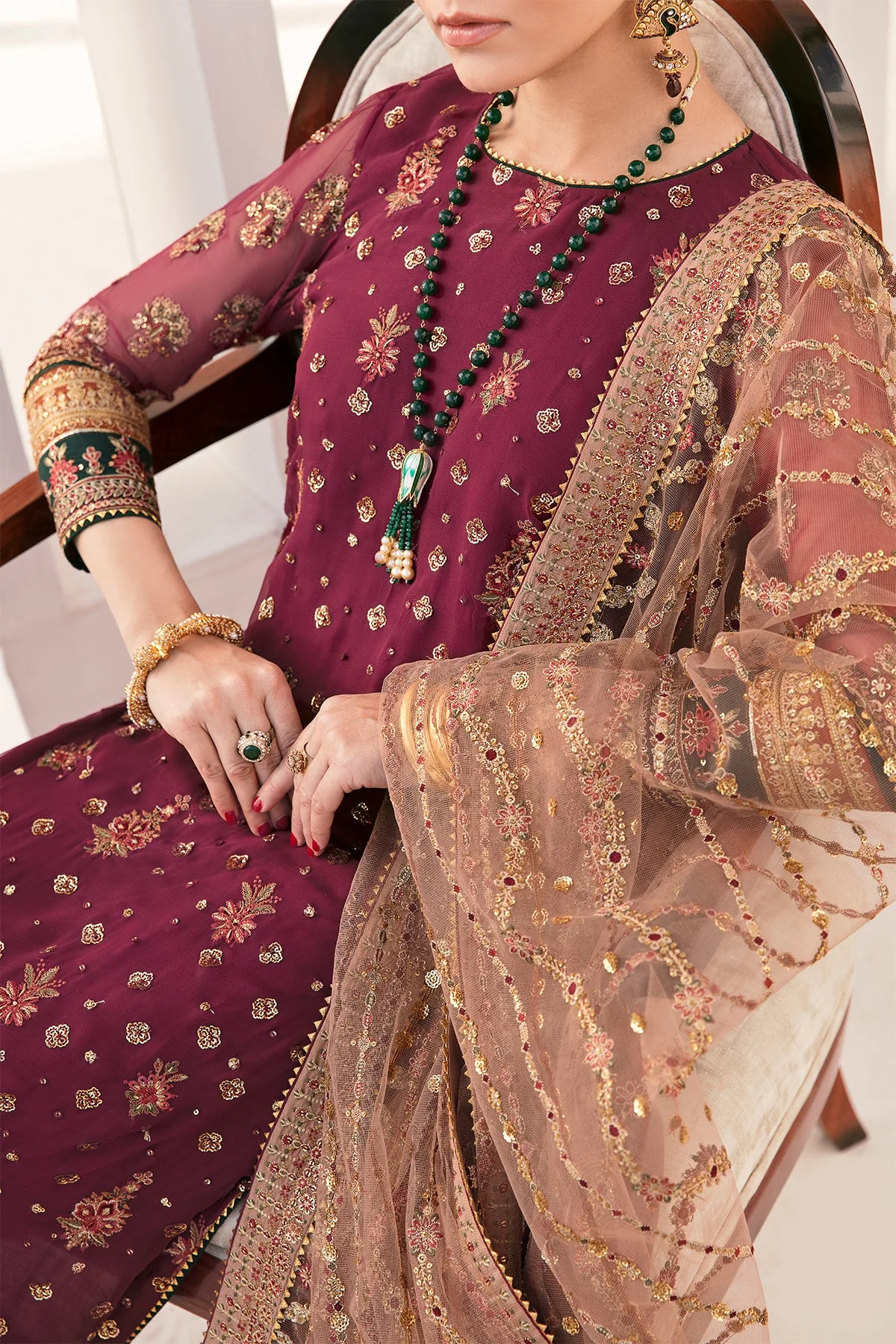 Where the timeless sophistication embraces the quintessence of style. This 3 piece chiffon ensemble includes an embroidered shirt having front, back and sleeves grip patches. The traditional allure is inculcated by the tassels hanging at the back. The shirt is paired with a stunning plain dyed silk trouser. The contrasted net dupatta heaves the flair of the outfit. Stitched and Unstitched option are available. So, choose whatever suits you best.