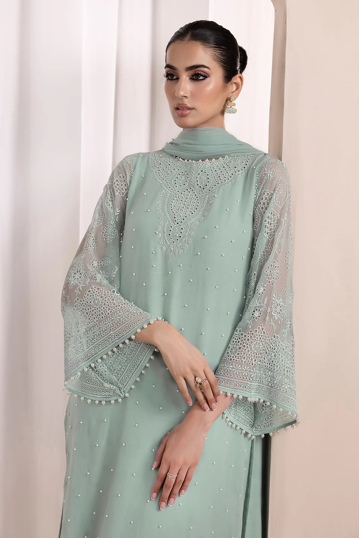 The EMBROIDERED CHIFFON PR-842 comes with a matching dupatta and trouser made from same embroidered chiffon fabric, along with all the necessary accessories.