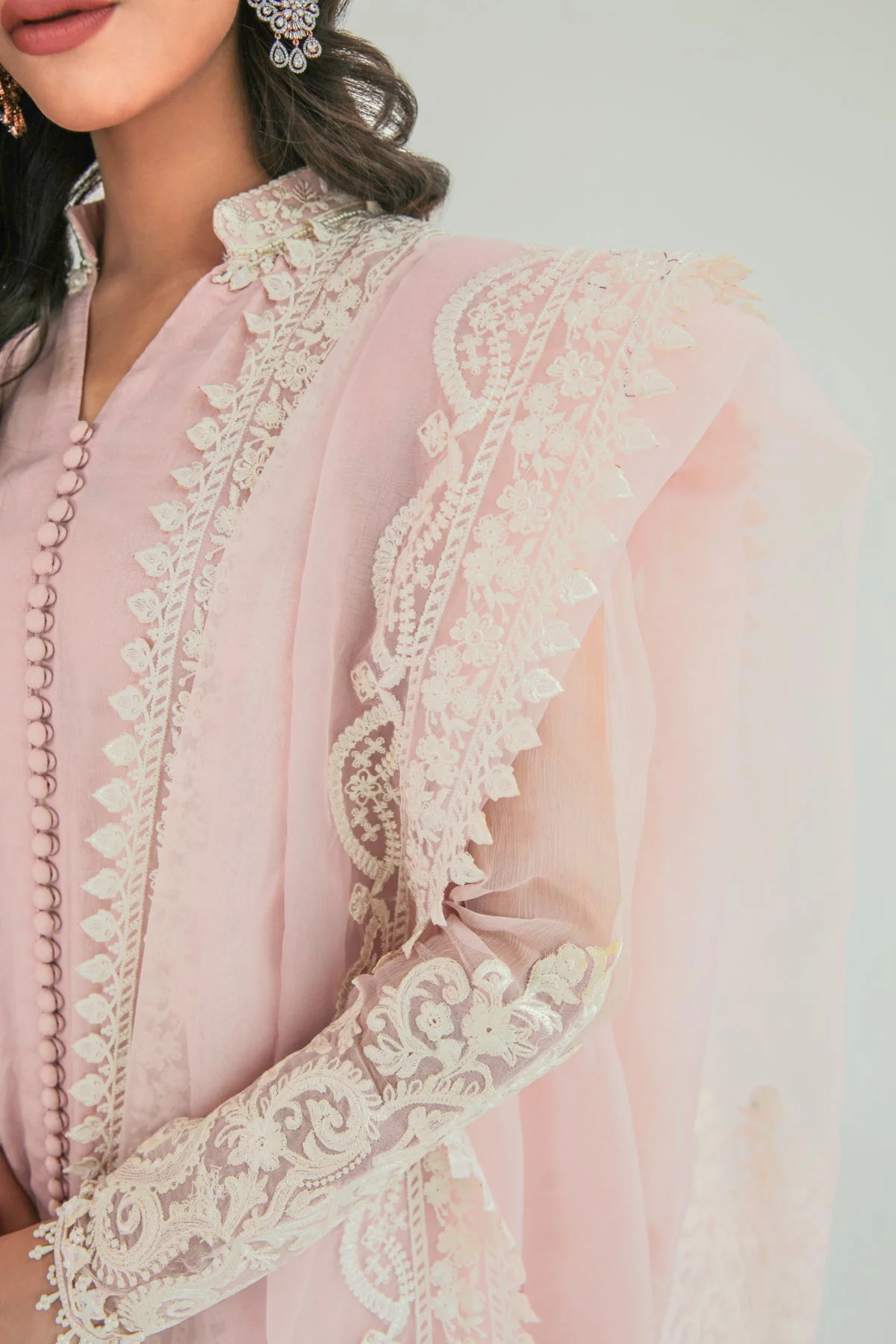 Presenting a 3-piece light pink chiffon ensemble featuring a frock with intricate embroidery on neckline, sleeves and mandarin collar. It comes with an exquisitely embroidered organza dupatta and a plain grip trouser. White embroidery runs smoothly over the canvas of a solid hue. The outfit is your go-to option for any gathering.
